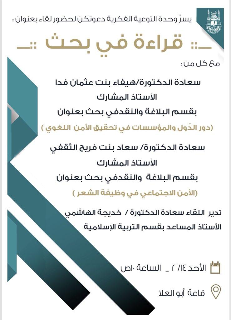وحدة التّوعية الفكريّة بكلية اللغة العربية بجامعة أم القرى تقيم لقاءً موضوعه : " قراءةٌ في بحثٍ ؛ لكلٍّ من : د. هيفاء بنت عثمان فدا ( الأستاذ المشارك بقسم البلاغة والنّقد ) ، ود. سعاد بنت فريح الثّقفيّ ( الأستاذ المشارك بقسم البلاغة والنّقد ) ، العاشرة صباح الْيَوْم 14 صفر في قاعة "أبو العُلا" بالزّاهر .