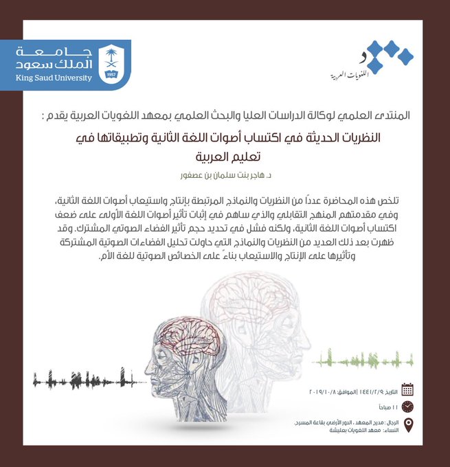نظمت وكالة الدراسات العليا والبحث العلمي بمعهد اللغويات العربية بجامعة الملك سعود المحاضرة الثانية بعنوان "النظريات الحديثة في اكتساب أصوات اللغة الثانية وتطبيقاتها في تعليم العربية" تقدمها أستاذ علم الفونولوجيا والأصوات الدكتورة هاجر بن عصفور.