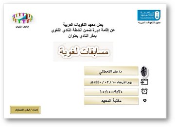 كما دعا معهد اللغويات العربية لحضور فعالية ومضات تعريفية بمعهد اللغويات العربية وذلك بعد غد الثلاثاء الساعة التاسعة صباحا.