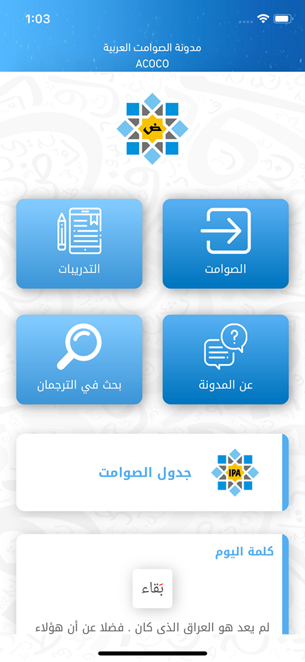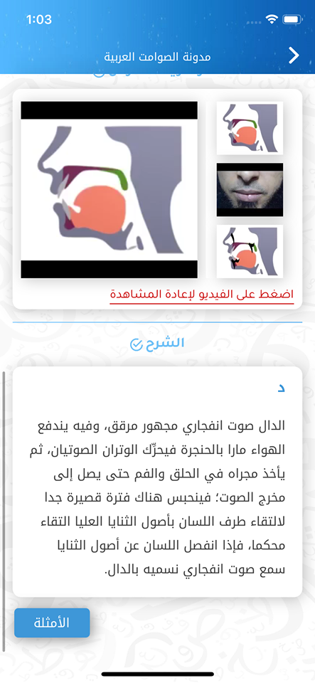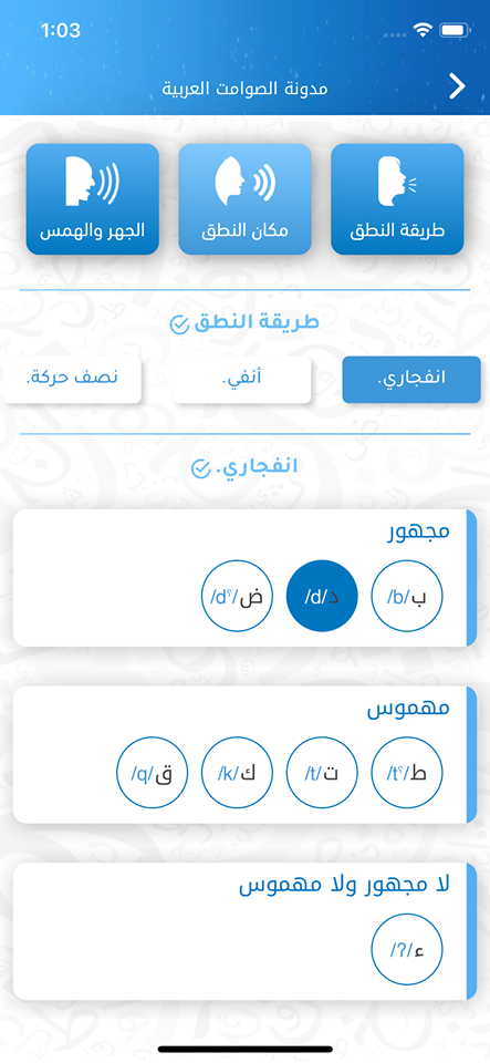 Arabic phonetics تطبيق جديد تم رفعه على متجر الأيفون Apple store لتعليم العربية للناطقين بغيرها؛ من أقسام التطبيق على الأيفون: