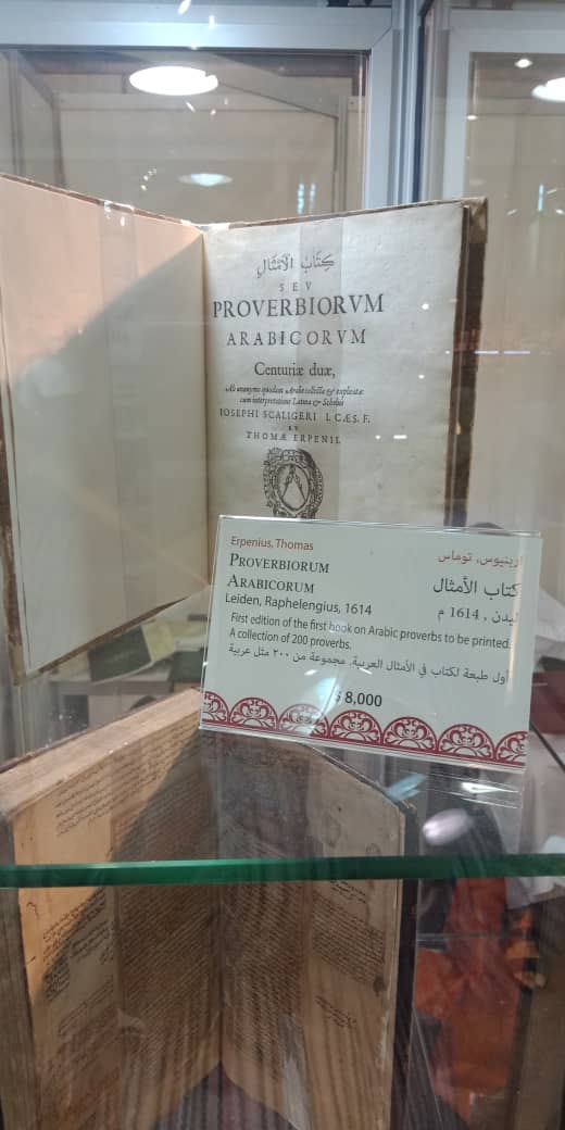 تعد أول طبعة عربية لكتاب "الأمثال العربية"، الذى يضم ما يقرب من 300 مثل عربى، والذى يعود إلى عام 1614م، لـ توماس أربنيوس، من المخطوطات النادرة، المعروضة فى معرض الشارقة الدولى للكتاب بدورته الـ 38، تحت شعار "افتح كتابا تفتح أذهانا".
