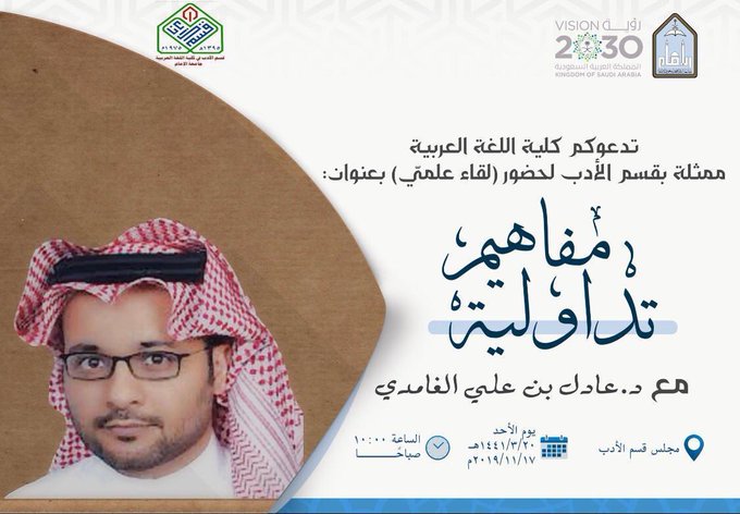 | كلية اللغة العربية بجامعة الإمام تدعو إلى اللقاء العلمي: "من أدبيات البحث العلمي" | مصطفى شعبان | أخبار ومناسبات لغوية | 0 | 11-10-2019 07:25 AM |