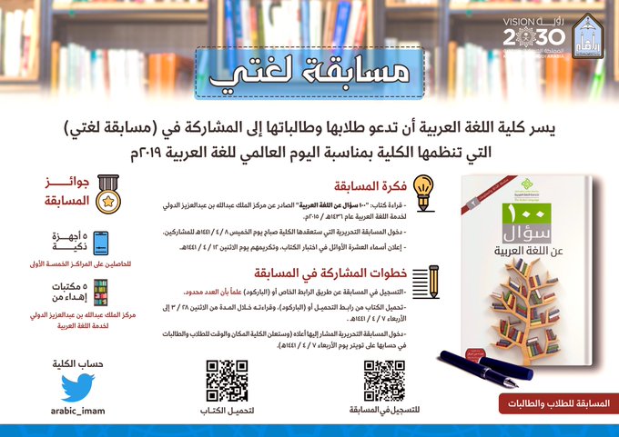 | كلية اللغة العربية بجامعة الإمام تنظم مسابقة (أجمل خط) لطلاب الكلية | مصطفى شعبان | أخبار ومناسبات لغوية | 0 | 02-19-2019 02:56 PM |