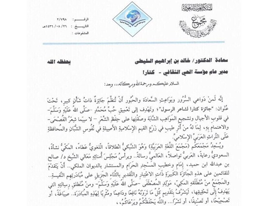 ووفقاً للخطاب، الذي حصلت “العرب” على نسخة منه، فإن المجمع، صاحب الرسالة العالمية والذي يحظى برعاية القيادة السعودية، يتقدم بالثناء على القائمين على الجائزة وذلك لمبادرتهم النفسية، مؤكدا أنه على استعداد لتقديم ما تراه كتارا نافعا ودافعا للجائزة .