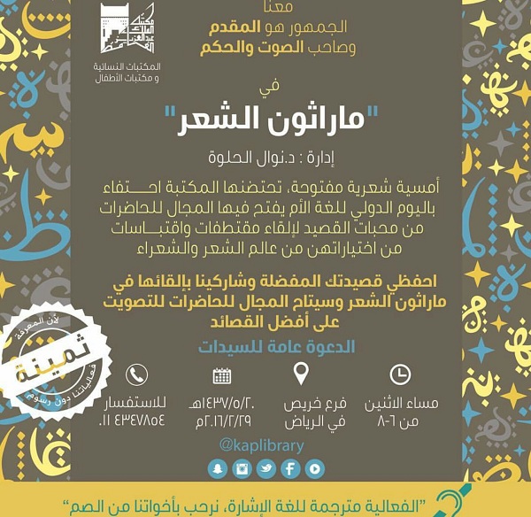 و«ماراثون الشعر» أمسية شعرية مفتوحة تحتضنها المكتبة احتفاء باليوم الدولي للغة الأم، ويفتح فيها المجال للحاضرات من محبات القصيد لإلقاء مقتطفات واقتباسات من اختياراتهن من عالم الشعر والشعراء. هذا وتترجم الفعالية إلى لغة الإشارة حرصا من المكتبة على حضور إخواننا الصم.