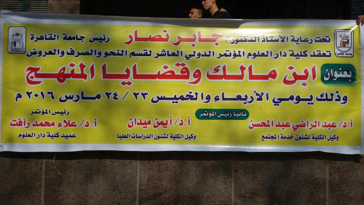 تنظم كلية دار العلوم بجامعة القاهرة، المؤتمر الدولي العاشر، لقسم النحو والصرف والعروض، تحت عنوان «ابن مالك وقضايا المنهج»، اليوم الأربعاء ويستمر لمدة يومين.