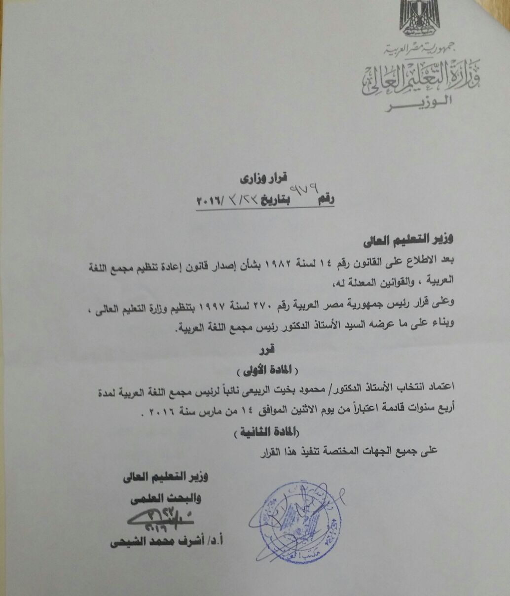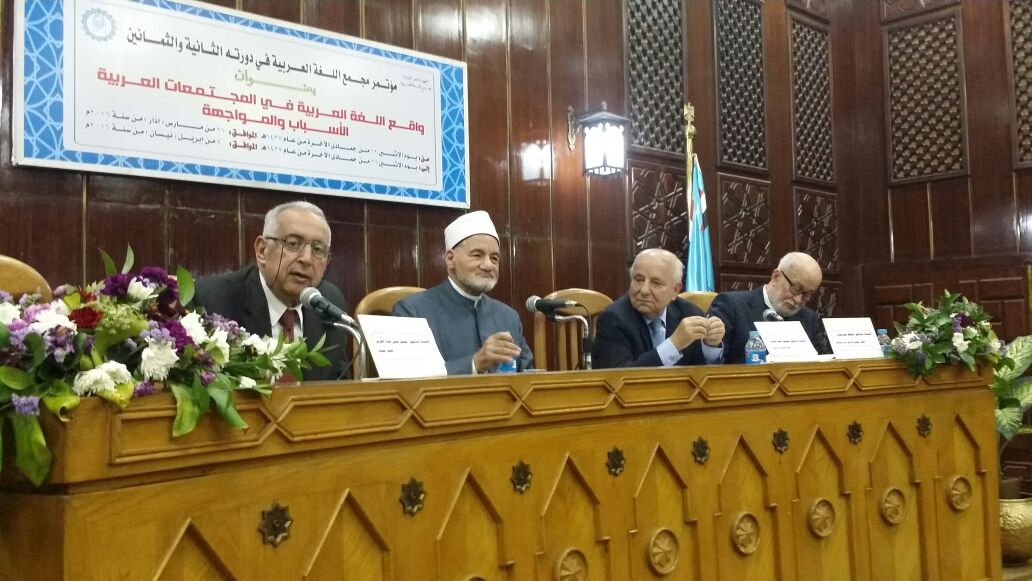 واصل مؤتمر مجمع اللغة العربية بالقاهرة- الذي يقام في الفترة من 12 من جمادى الآخرة 1437 هـ إلى 26 من جمادى الآخرة 1437 هـ تحت عنوان  : الأسباب والمواجهة) واصل فعالياته لليوم الرابع الخميس 15 من جمادى الآخرة 1437 هـ ؛ حيث عقد جلسة مغلقة من العاشرة صباحا حتى الثانية عشرة ظهرا ناقش خلالها الأعمال المقدمة من لجنتي أصول اللغة والألفاظ والأساليب واللهجات والبحوث اللغوية، ورأس هذه الجلسة الدكتور علي القاسمي- عضو المجمع المراسل من العراق، وشهدت الجلسة أيضا دعوة الأستاذ فاروق شوشة- الأمين العام للمجمع- للدكتور محمود الربيعي- نائب رئيس المجمع الجديد- للجلوس في مقعد النائب بعد صدور القرار الوزاري باعتماد انتخابه نائبا لرئيس المجمع لمدة أربع سنوات قادمة خلفا للأستاذ الدكتور محمد حماسة عبداللطيف- يرحمه الله- وتحدث الربيعي شاكرا أعضاء المجمع الذين أولوه ثقتهم، وتمنى أن يوفق في مهمته بالتعاون مع رئيس المجمع وأمينه العام.