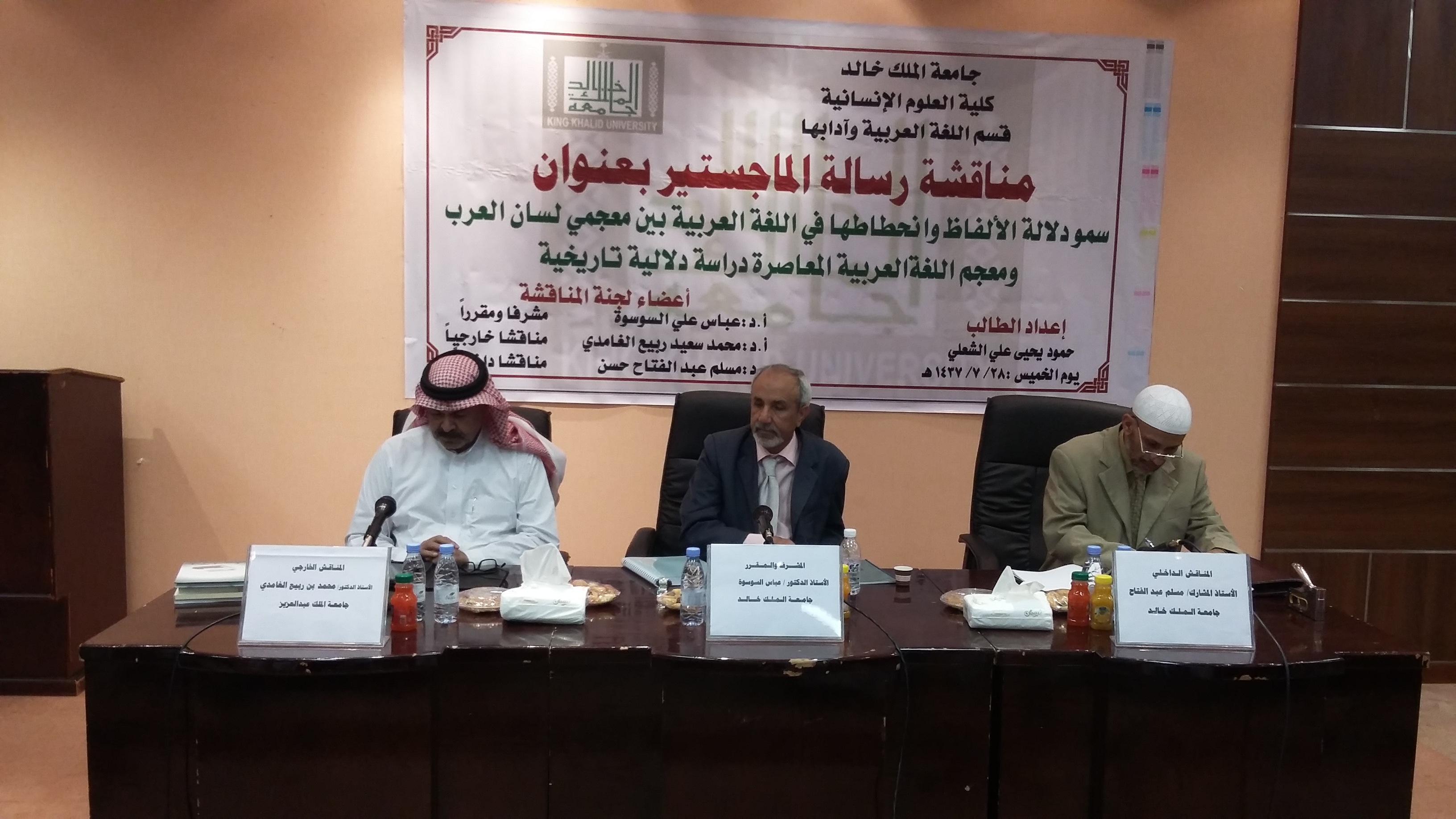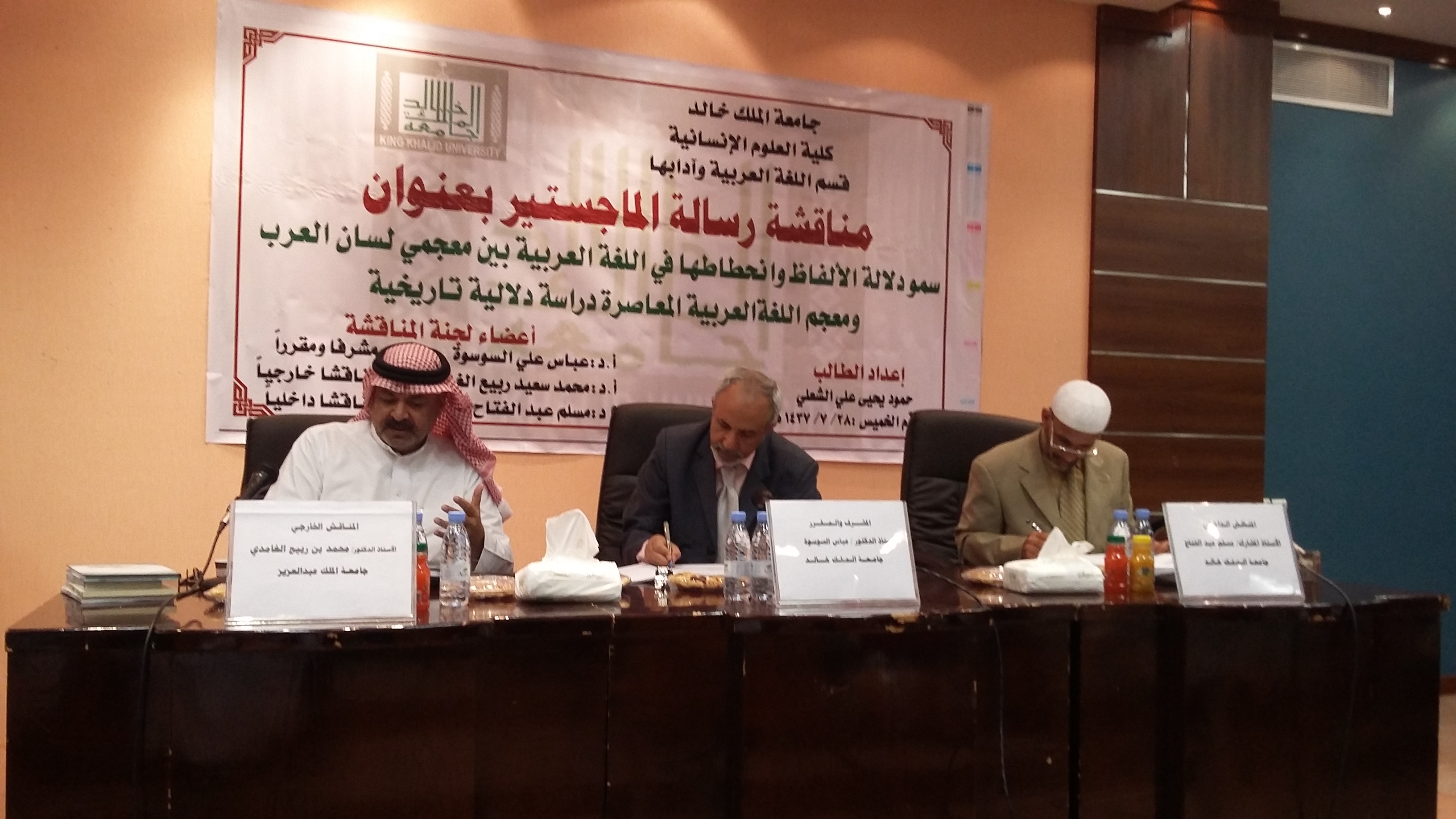 في رحاب كلية العلوم الإنسانية بجامعة الملك خالد في أبها ناقش الطالب / حمود يحيى علي الشعلي رسالته للماجستير بعنوان “سمو دلالة الألفاظ وانحطاطها في اللغة العربية بين معجمي لسان العرب ومعجم اللغة العربية المعاصرة- دراسة دلالية تاريخية” أجيز الطالب وعمله بعد مناقشة استمرت ساعتين.