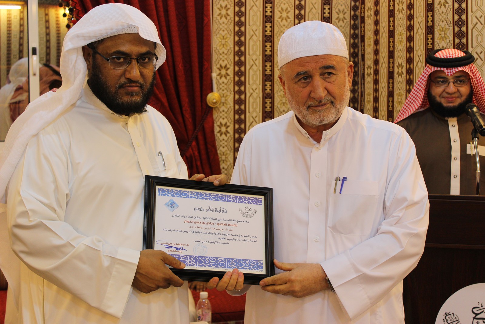 وفي الختام قدّم رئيس المجمع شهادة شكر وتقدير للمحاضر على جهوده الطّيّبة في خدمة اللّغة العربيّة، ثمّ دعا الجميع إلى طعام السّحور.
