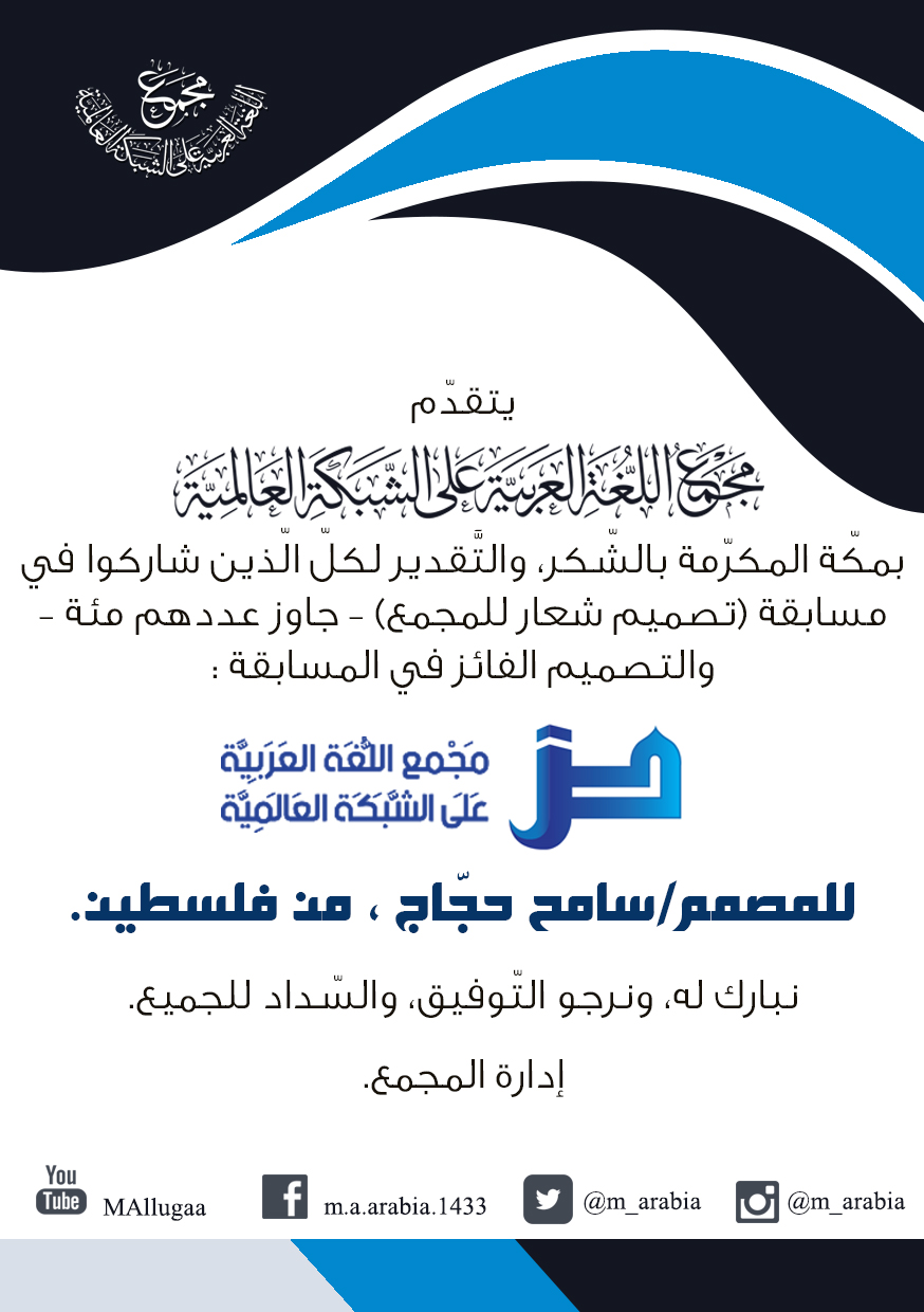 يتقدّم مجمع اللغة العربية على الشبكة العالمية بمكّة المكرّمة بالشّكر، والتَّقدير لكلّ الّذين شاركوا في مسابقة (تصميم شعار للمجمع) – جاوز عددهم مئة – والفائز في المسابقة: