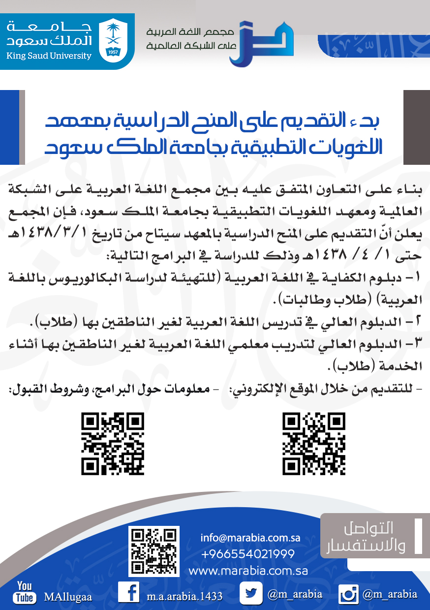 > الأخبار > أخبار المجمع والمجمعيين > بدء التقديم على المنح الدراسية بمعهد اللغويات التطبيقية بجامعة الملك سعود