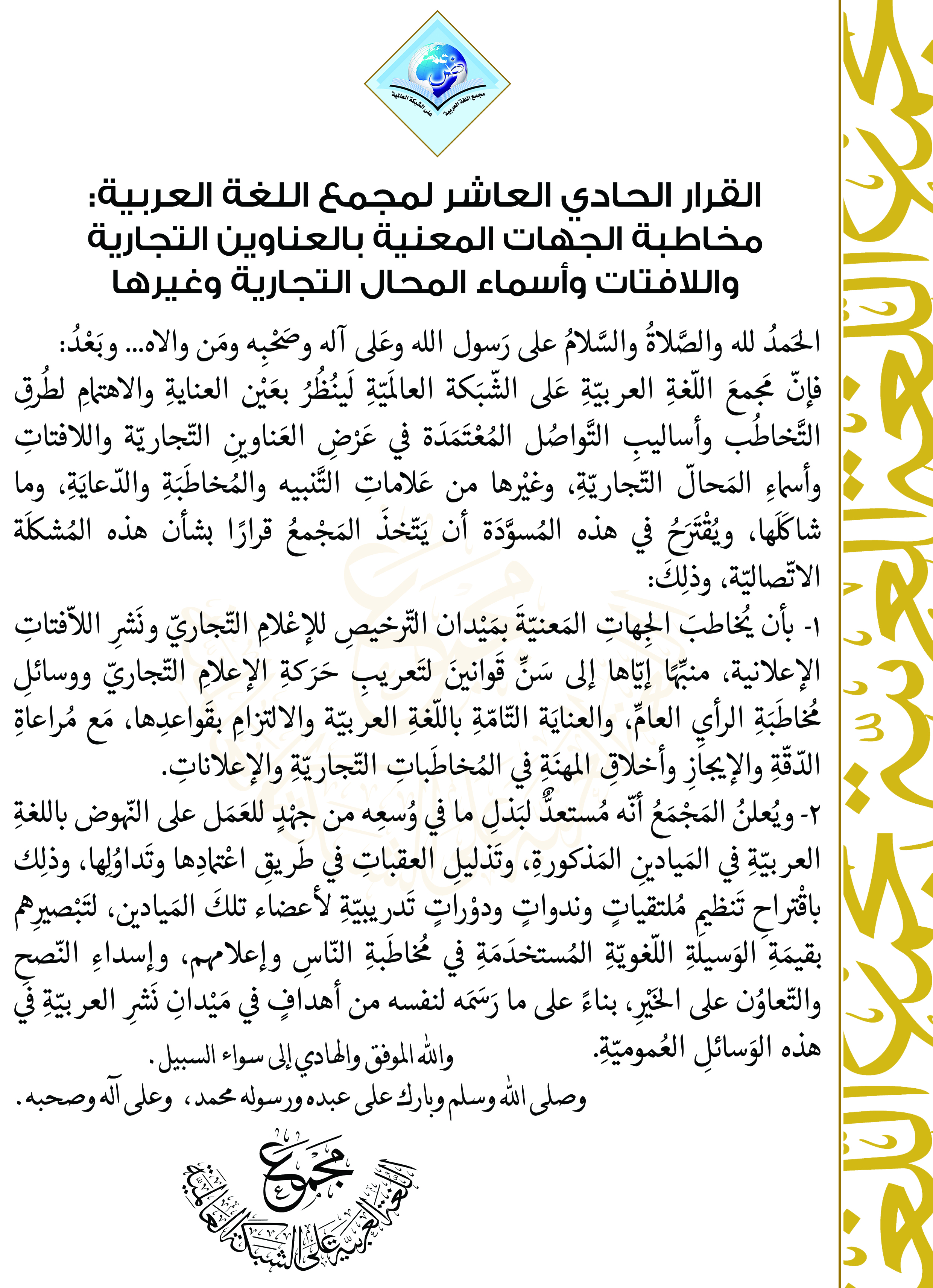 القرار الحادي العاشر لمجمع اللغة العربية على الشبكة العالمية: