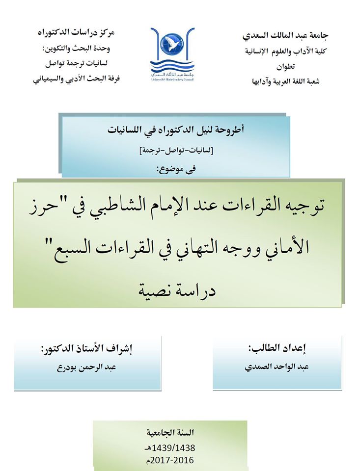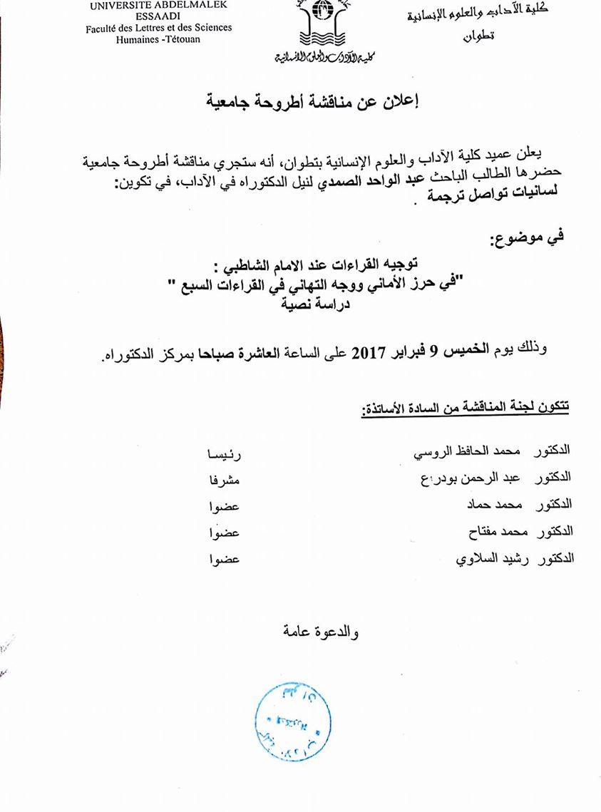 أشرَفَ نائب رئيس المَجمع أ.د. عبدالرحمن بودرع على أطروحة دكتوراه نوقشَت بكلية الآداب جامعة عبد المالك السعدي يوم الخَميس 11 جُمادى الأولى 1438 الموافق  فبراير 2017م وكانت في موضوع: تَوجيه القراءات عند الإمام الشاطبي في “حرز الأماني ووجه التهاني” في القراءات السبع، دراسة نصية ، وقد حصل الباحثُ على درجة الدكتوراه في اللغويات بميزة مشرف جدا والتوصية بطبع الأطروحَة.