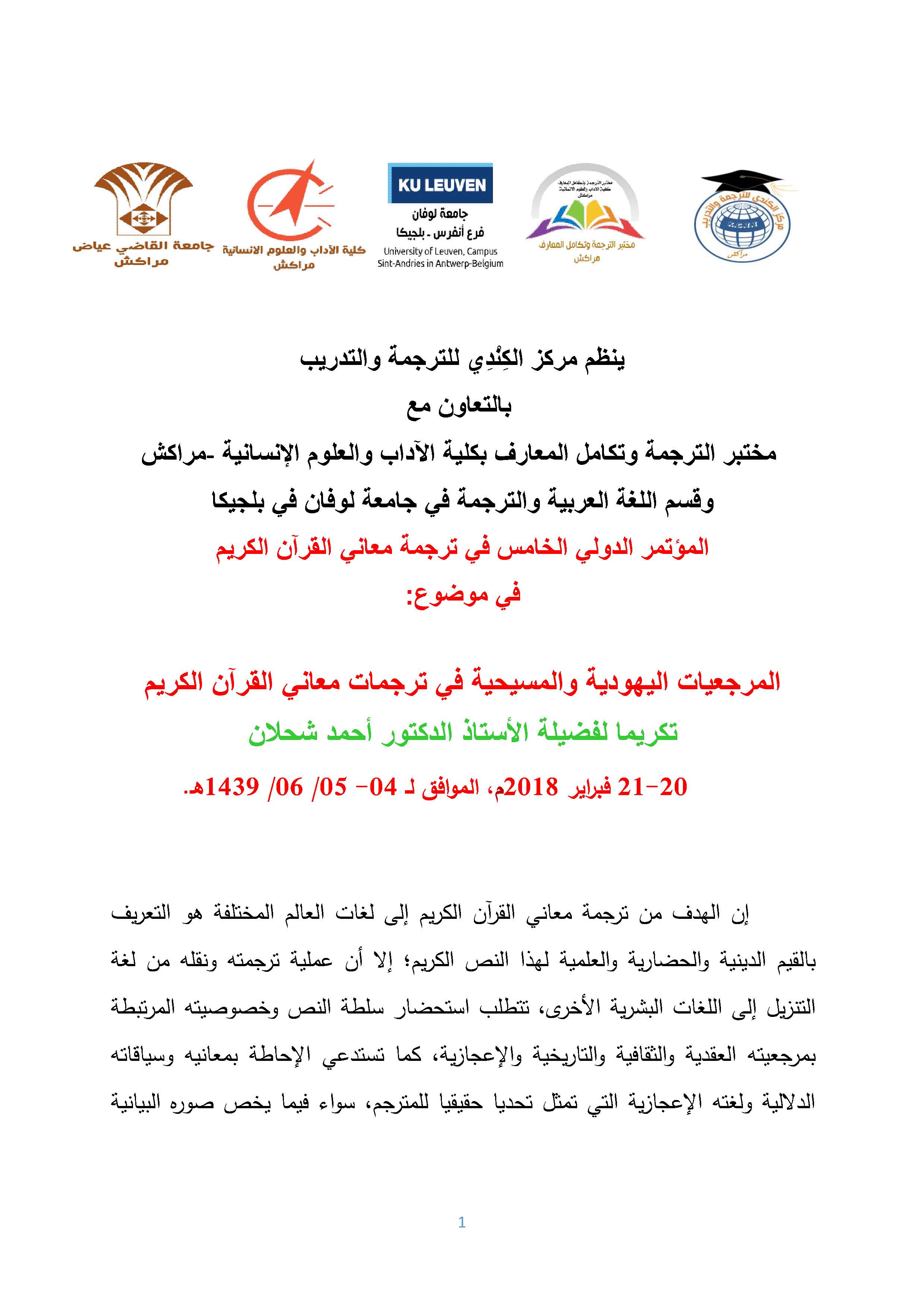 ﯾﻧظم ﻣرﻛز اﻟﻛِﻧْدِي ﻟﻠﺗرﺟﻣﺔ واﻟﺗدرﯾب ﺑﺎﻟﺗﻌﺎون ﻣﻊ ﻣﺧﺗﺑر اﻟﺗرﺟﻣﺔ وﺗﻛﺎﻣل اﻟﻣﻌﺎرف ﺑﻛﻠﯾﺔ اﻵداب واﻟﻌﻠوم اﻹﻧﺳﺎﻧﯾﺔ -ﻣراﻛش وﻗﺳم اﻟﻠﻐﺔ اﻟﻌرﺑﯾﺔ واﻟﺗرﺟﻣﺔ ﻓﻲ ﺟﺎﻣﻌﺔ ﻟوﻓﺎن ﻓﻲ ﺑﻠﺟﯾﻛﺎ اﻟﻣؤﺗﻣر اﻟدوﻟﻲ اﻟﺧﺎﻣس ﻓﻲ ﺗرﺟﻣﺔ ﻣﻌﺎﻧﻲ اﻟﻘرآن اﻟﻛرﯾم ﻓﻲ ﻣوﺿوع: