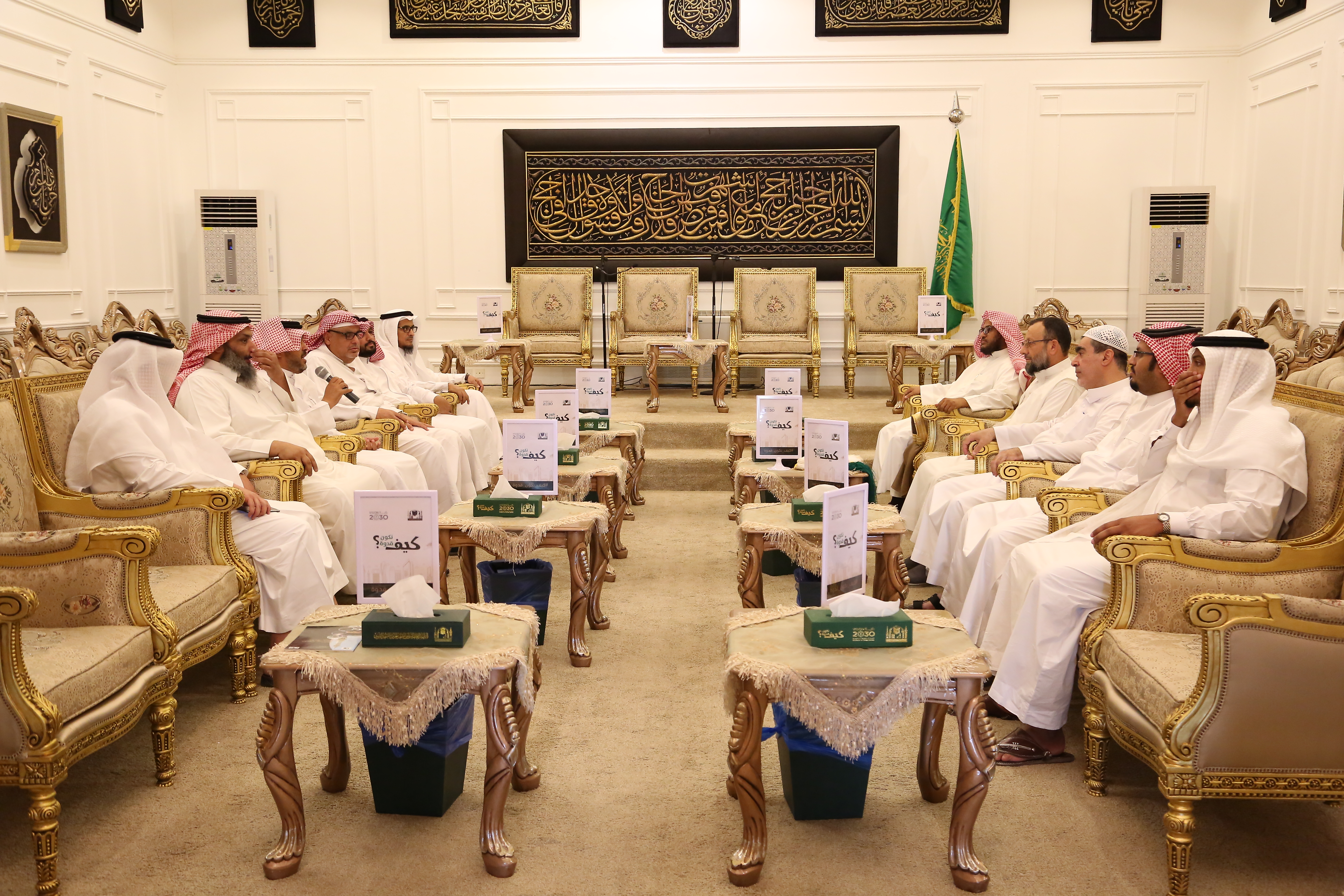 زار وفد من مجمع اللغة العربية المكي مجمع الملك عبدالعزيز لكسوة الكعبة المشرفة؛ للاطلاع على سير الإنتاج في المجمع، والاستماع إلى شرح مفصل لطريقة تطريز الآيات القرآنية وعمل الزخارف الإسلامية على الحرير الطبيعي، وكان في استقبالهم سعادة وكيل المجمع للشؤون الإدارية الأستاذ هشام بن سليمان علاء الدين، الذي رحب بالوفد، مشيداً بدور المجمع اللغوي المكي في خدمة اللغة العربية، والنهوض بمقامها، وإبراز مكانتها، وبعث تراثها، منوهًا برؤية المجمع في تحقيق الريادة بخدمة لغة القرآن الكريم.