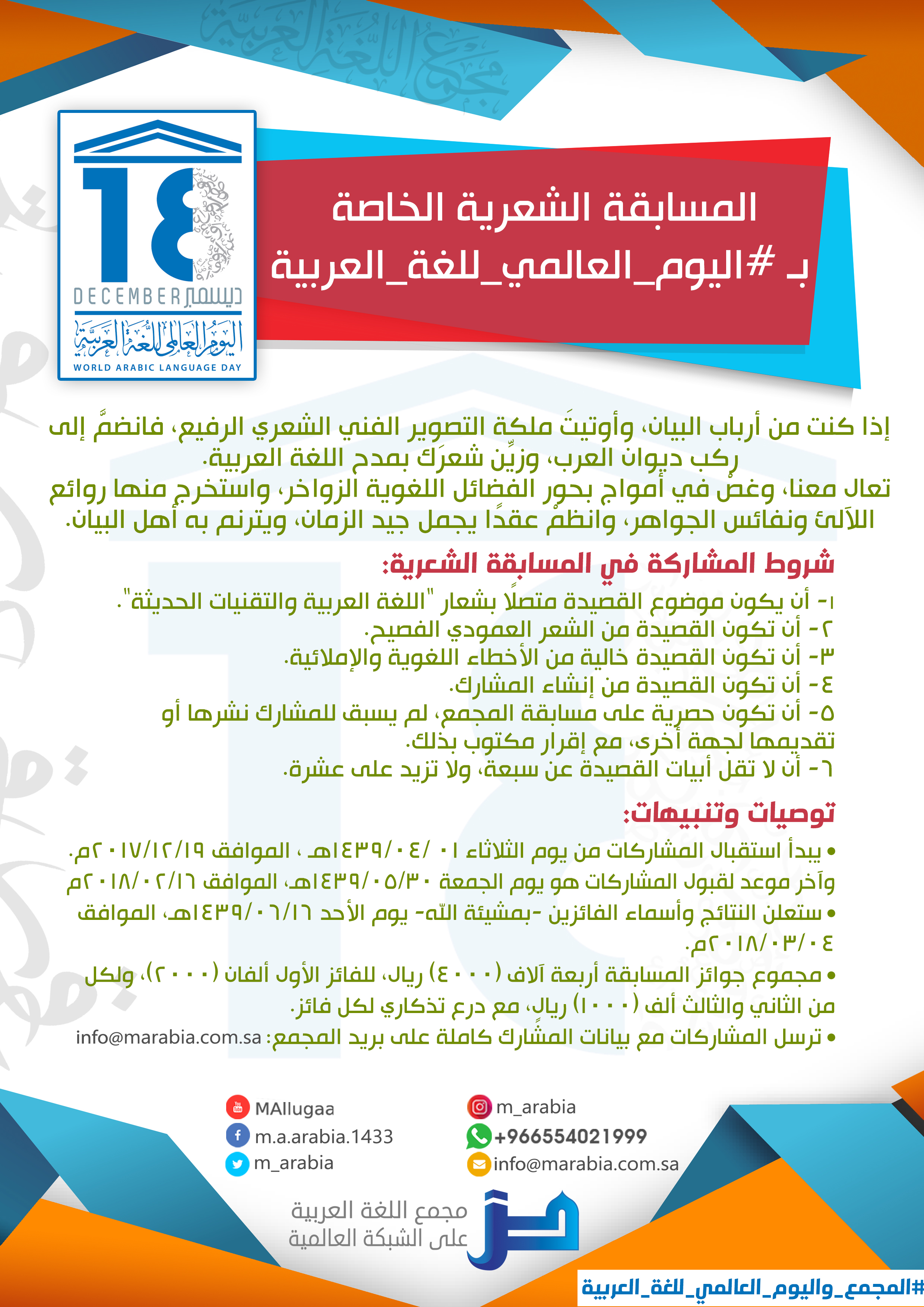 1- أن يكون موضوع القصيدة متصلًا بشعار “اللغة العربية والتقنيات الحديثة”.
