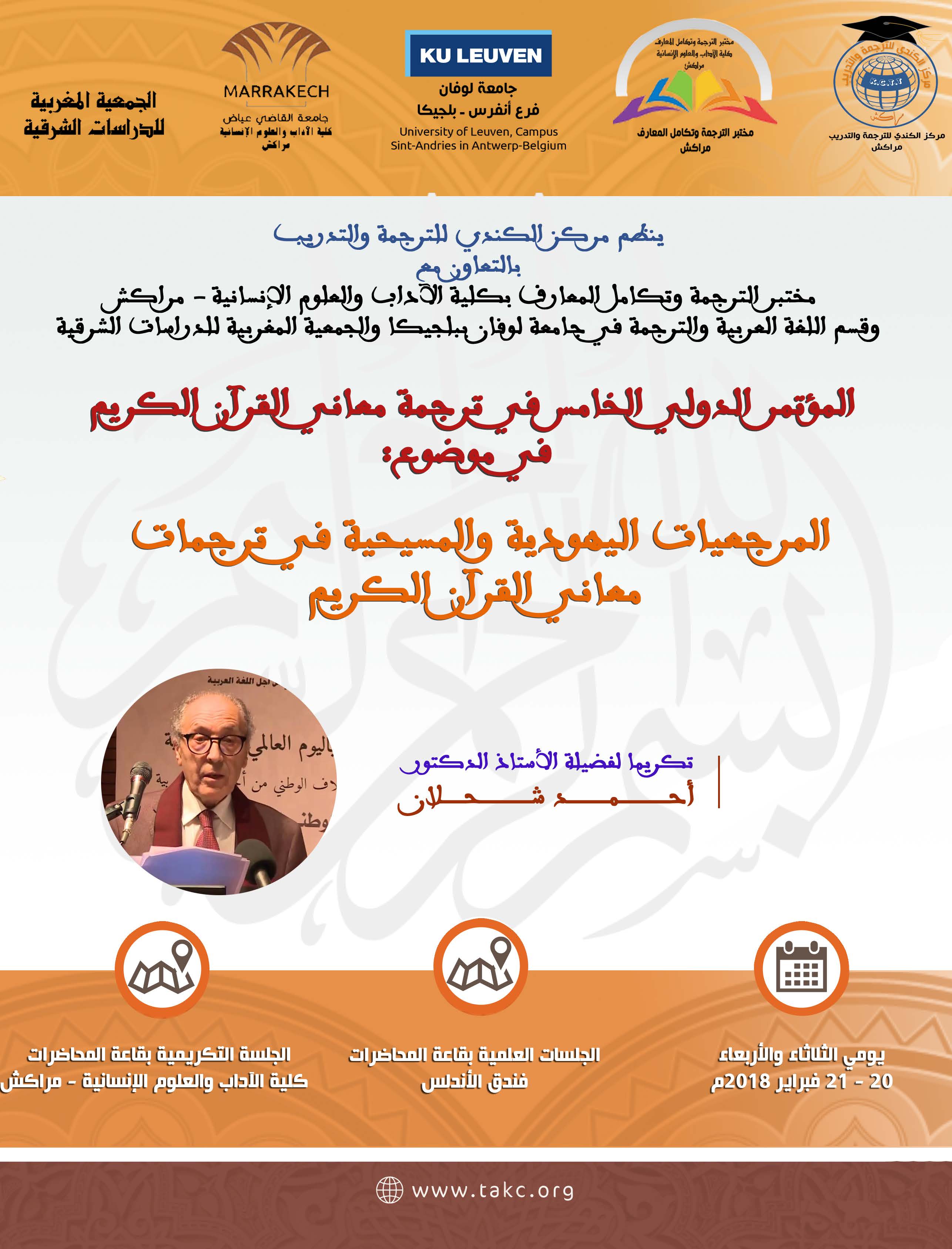 يشارك عضو المجمع الأستاذ الدكتور عبدالرحمن السليمان يومي 20 و21 من شهر فبراير الجاري في تنظيم مؤتمر في جامعة القاضي عياض في مراكش (المؤتمر الدولي الخامس في ترجمة معاني القرآن الكريم، في موضوع: “المرجعيات اليهودية والمسيحية في ترجمات معاني القرآن الكريم” تكريما للأستاذ الدكتور أحمد شحلان).