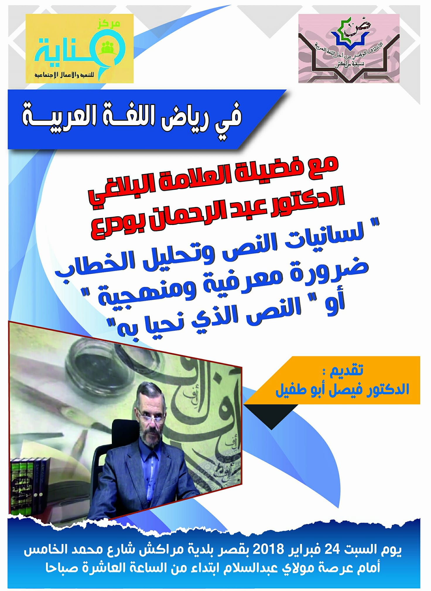 في إطار منتدى رياض اللغة العربية نظمت تنسيقية مراكش للائتلاف الوطني من أجل اللغة العربية بشراكة وتعاون مع مركز عناية للتنمية والأعمال الاجتماعية بالمغرب لقاء ثقافيا على شرف الأستاذ الدكتور عبدالرحمن بودرع، ألقى من خلاله محاضرةً في موضوع :” لسانيات النص وتحليل الخطاب ضرورة معرفية ومنهجية. أو النص الذي نحيا به”.
