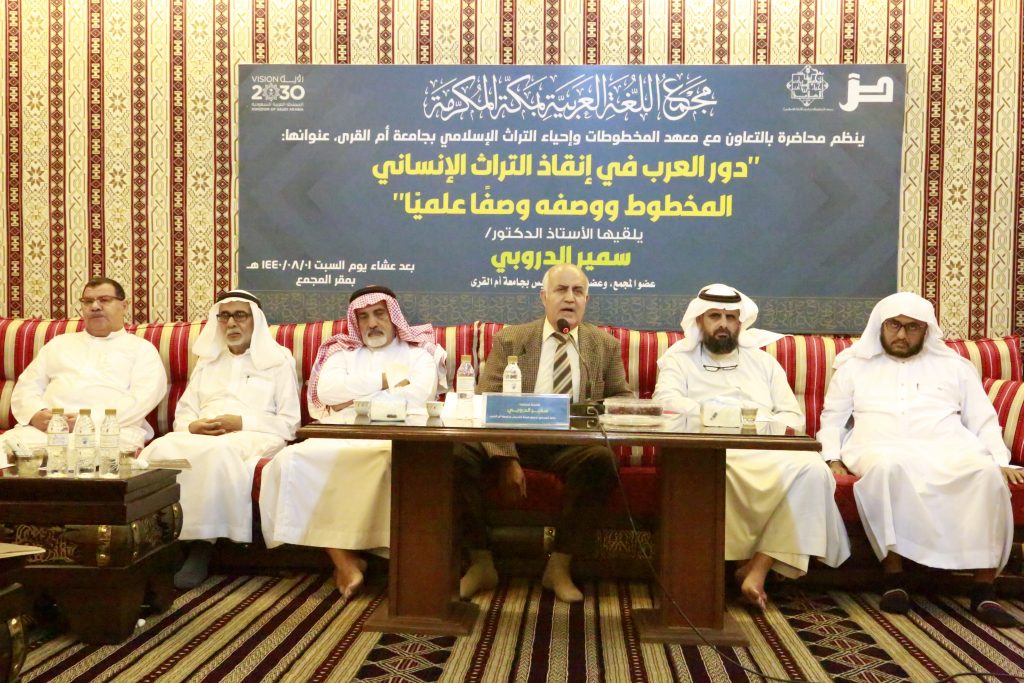 واستضاف المجمع لهذه الأمسية الأستاذ الدكتور سمير الدروبي عضو المجمع، عضو هيئة التدريس بجامعة أم القرى؛ لإلقاءِ محاضرةٍ عن “دورِ العربِ في إنقاذِ التراثِ الإنسانيِّ ووصفِه وصفًا علميًّا دقيقًا”.