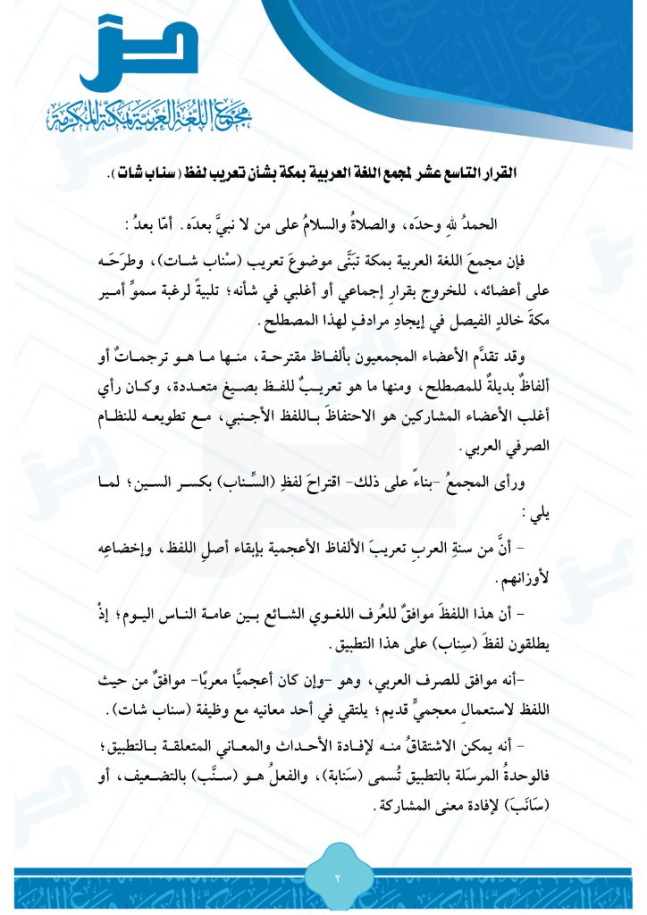 استجابة لرغبة مستشار خادم الحرمين الشريفين أمير منطقة مكة المكرمة صاحب السمو الملكي الأمير خالد الفيصل في إيجاد مرادف عربي لمصطلح (السِّناب شات) الأجنبي الصرف، التي أعلنها خلال إطلاق سموه جائزة إمارة منطقة مكة للإعلام الجديد في موسم الحج الماضي، -تبني مجمع اللغة العربية بمكة المكرمة هذا المشروع ودرس تعريب هذا اللفظ مع أعضاء المجمع العاملين والمشاركين والمؤازرين على مدى أكثر من شهرين.