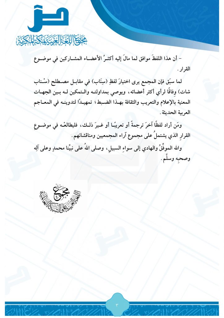 وختم الأستاذ الدكتور عبدالعزيز الحربي رئيس مجمع اللغة العربية بمكة بالقول إن المجمع يرى اختيار لفظِ (سِنَاب) في مقابل مصطلح (سناب شات) وِفاقاً لرأي أكثر أعضائه، ويوصي بمداولته والتمكين له بين الجهات المعنية بالإعلام والتعريب والثقافة بهذا الضبط، تمهيدًا لتدوينه في المعاجم العربية الحديثة