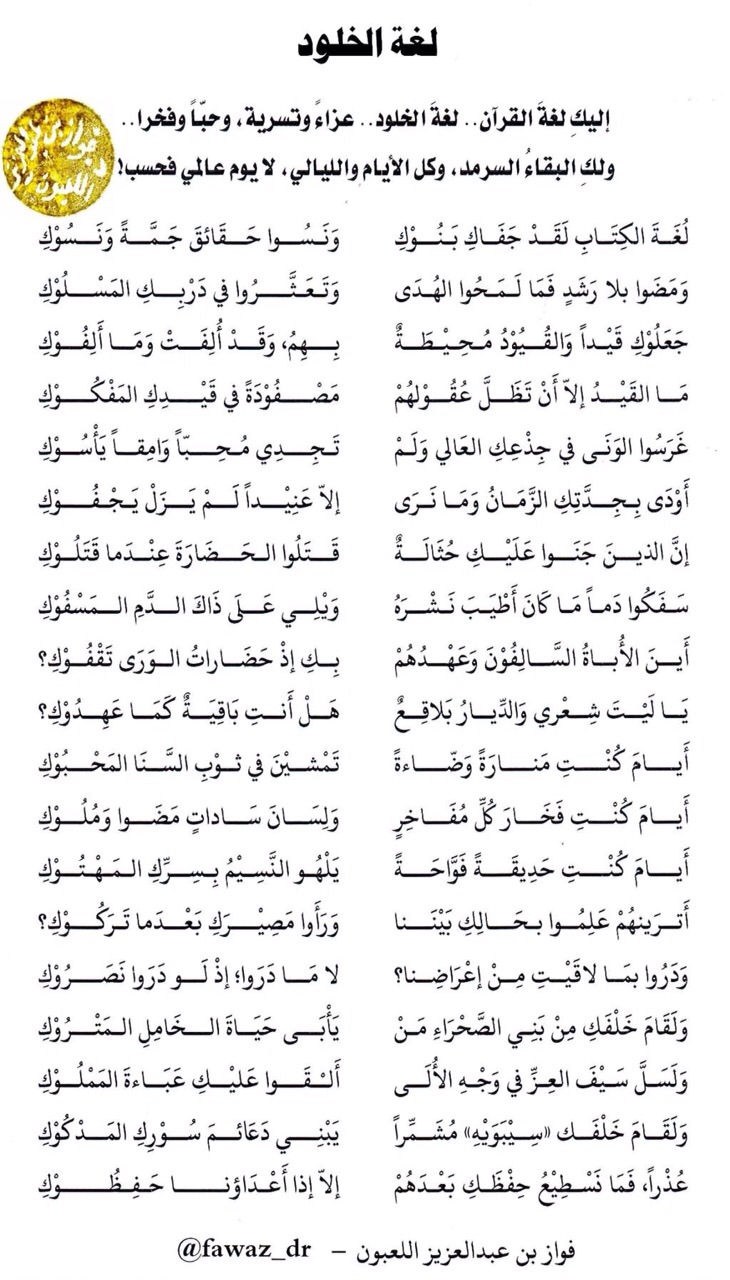 موقع مجمع اللغة العربية > المجمع واليوم العالمي للغة العربية 2014 > لغة الخلود (قصيدة) – د. فواز اللعبون