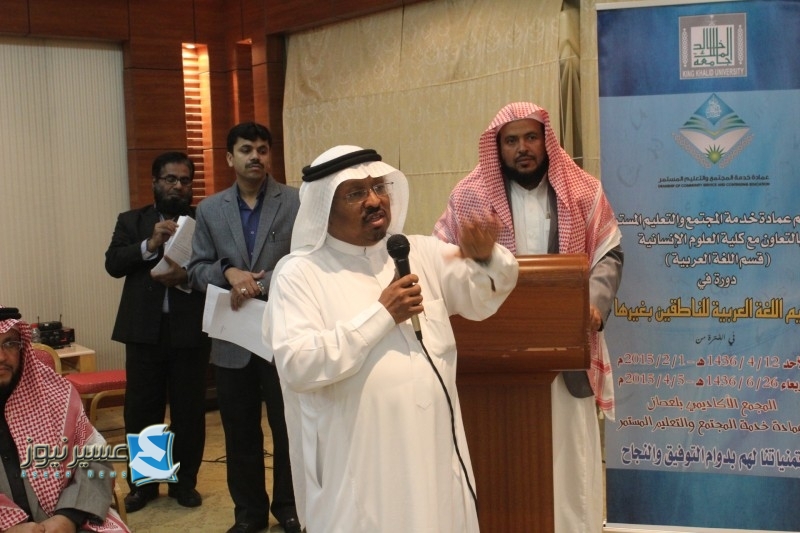 بتوجيه من معالي مدير الجامعة فقد انطلقت دورة تعليم اللغة العربية للناطقين بغيرها التي تنظمها عمادة خدمة المجتمع والتعليم المستمر بالتعاون مع كلية العلوم الإنسانية (قسم اللغة العربية)  في مقر الضيافة بلعصان يوم الأحد الـ 12 من الشهر الجاري (1436هـ)، ولمدة (9) أسابيع خلال الفترة المسائية من الساعة 6:30 م الى 8:30 م . وقد تم تنظيم حفل افتتاح لهذه الدورة بحضور كل من سعادة عميد عمادة خدمة المجتمع والتعليم المستمر د. مبارك بن سعيد ناصر حمدان وأيضا و و سعادة عميد كلية العلوم الإنسانية د. يحي الشريف ورئيس قسم اللغة العربية د. عبدالرحمن المحسني وأعضاء هيئة التدريس الذين سيتولون التدريس وهم سعادة د.محمد الحازمي ود. محمد سلامة و د. عبدالرحمن البارقي و أ. ياسر زايد. كما حضر ما يقرب من 90 عضواً من أعضاء هيئة التدريس من منسوبي الجامعة الملتحقين بالدورة من مختلف كليات الجامعة. وقد اشتمل برنامج الحفل على القرآن الكريم حيث شارك في التلاوة المحاضر محمد شمس الرب من عمادة خدمة المجتمع والتعليم المستمر.