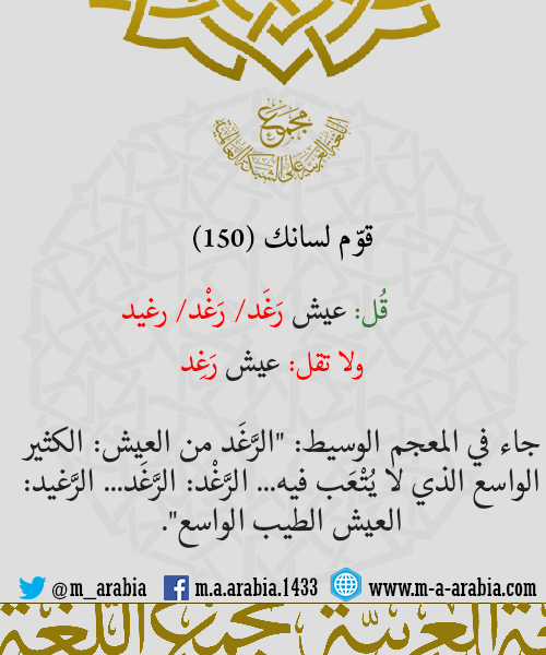 قوّم لسانك (150) - قُل: عيش رَغَد/ رَغْد/ رغيد، ولا تقل: رَغِد