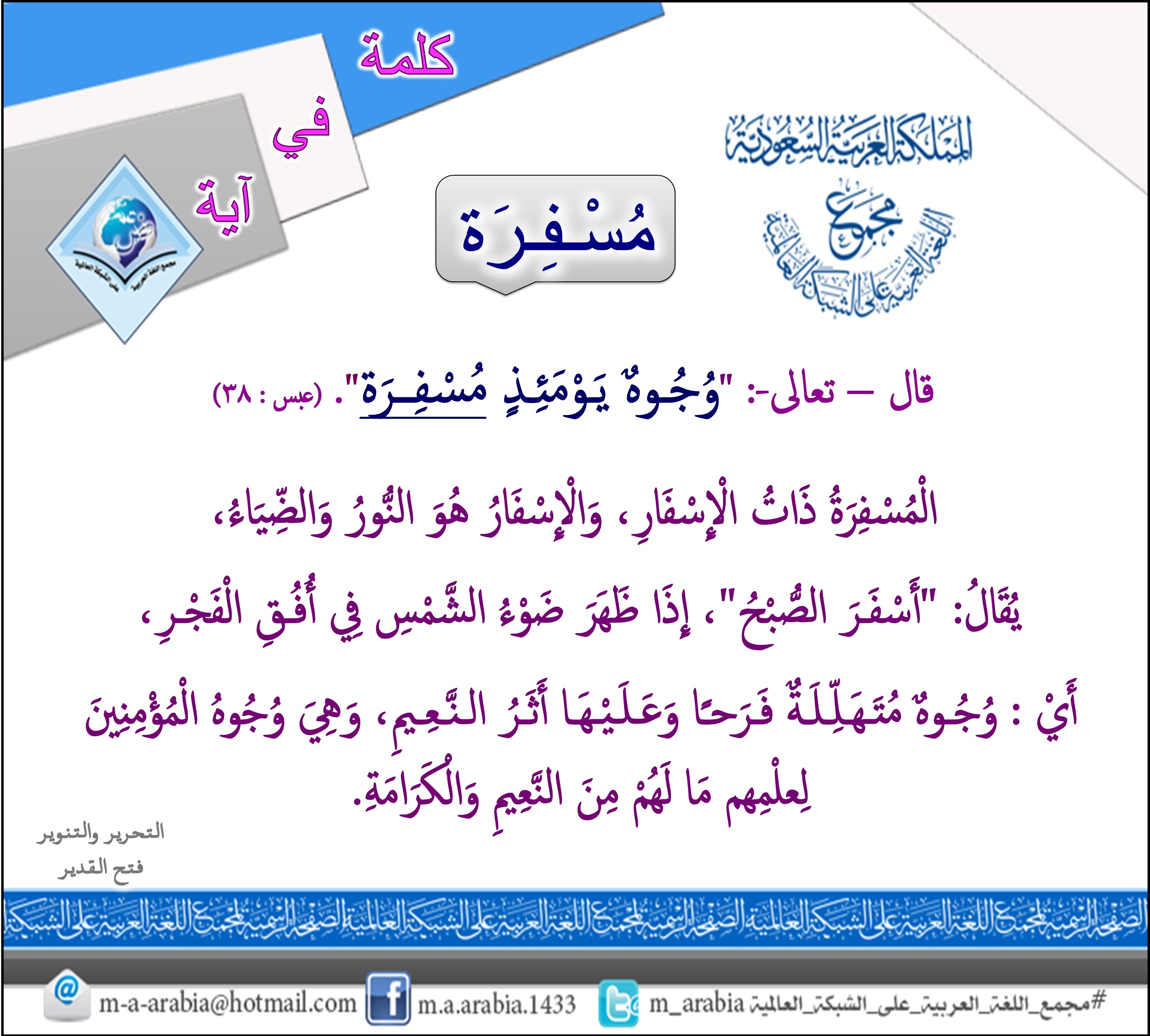 #كلمة في آية: (مُسْفِرَة) في قوله – تعالى-: "وُجُـوهٌ يَـوْمَئِـذٍ مُسْفِــرَة"