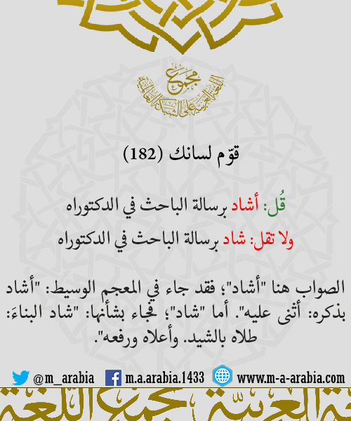 قوّم لسانك (182) - قُل: أشاد برسالة الباحث في الدكتوراه، ولا تقل: شاد