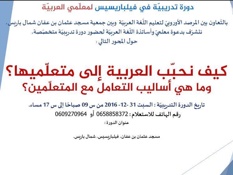 يستعد المرصد الأوروبي لتعليم اللغة العربيّة بالتعاون مع جمعيّة عثمان بن عفان للقيام بدورة تدريبيّة متخصصة تستهدف معلمي وأساتذة اللغة العربية في فيلباريسيس شمال باريس يوم السبت الموافق 31-12-2016 ؛ وذلك بهدف تحبيب العربيّة في نفوس متعلّميها وحرصًا على ضرورة الحفاظ على الثقافة العربية ولغتها ونشرها في مختلف أرجاء العالم.