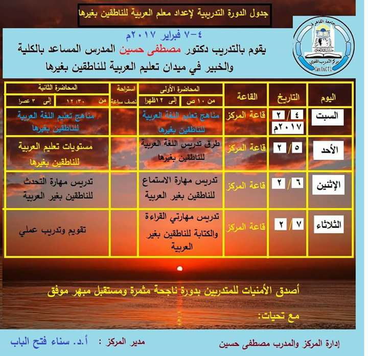 ستنطلق بمركز التدريب اللغوي بكلية دار العلوم جامعة القاهرة دورة إعداد معلم اللغة العربية للناطقين بغيرها، وذلك في العاشرة من صباح اليوم السبت 4 فبراير 2017م،