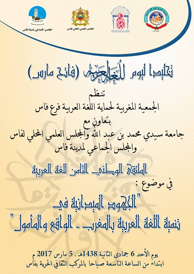 وذلك يوم الأحد 5 مارس بمركب الحرية بفاس، ابتداءً من الساعة التاسعة صباحًا والذي سيعرف مشاركة أساتذة وخبراء في مجال تطوير وتنمية اللغة العربية على المستوى العلمي والبيداغوجي.