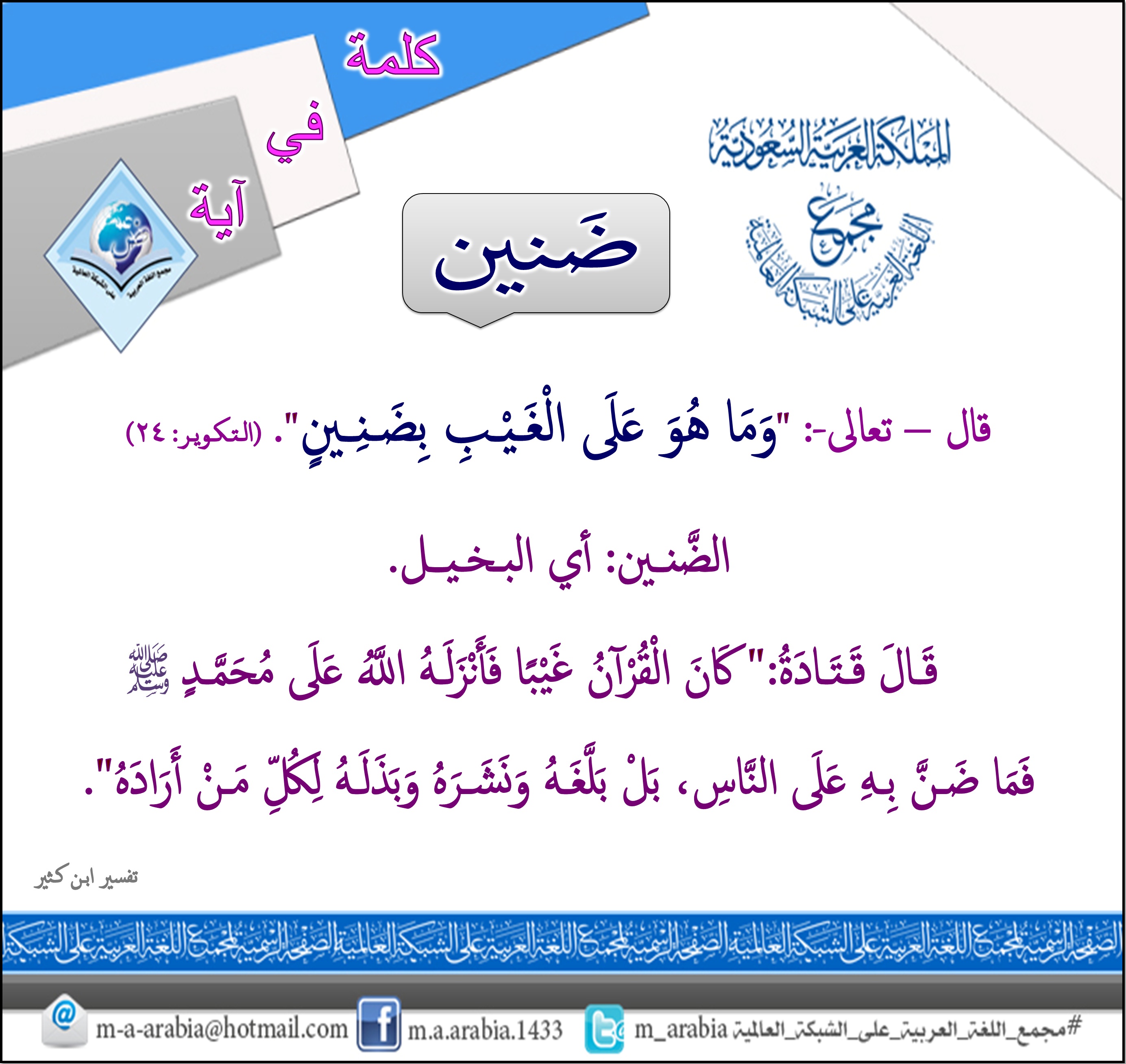 #كلمة_في_آية: (ضَنين) في قوله – تعالى-: "ومَا هُوَ عَلَى الْغَـيْـبِ بِضَـنِــين"