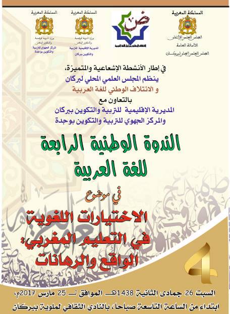 الندوة الوطنية الرابعة للغة العربية في موضوع:" الاختبارات اللغوية في التعليم المغربي: الواقع والرهانات وذلك يوم السبت 25 مارس 2017م، ابتداء من التاسعة صباحا، بالنادي الثقافي لملوية بمدينة بركان فمرحبا بالجميع.