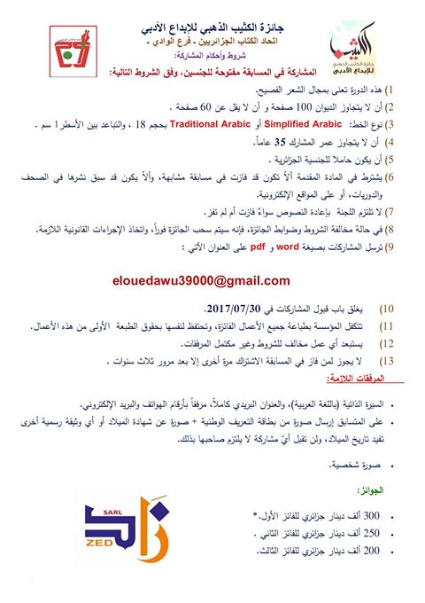 [IMG][/IMG]أطلق فرع الوادي في اتحاد الكتاب الجزائريين جائزة الكثيب الذهبي للإبداع الأدبي وهي مخصصة للشعر الفصيح، وقد حدد المنظمون شروط المشاركة في أن لا يتجاوز الديوان 100 صفحة وأن لا يقل عن 60 صفحة، ونوع الخط: Simplified Arabic أو Traditional Arabic بحجم 18 ، والتباعد بين الأسطر1 سم، وأن لا يتجاوز عمر المشارك 35 عاماً، وأن يكون حاملا للجنسية الجزائرية و يشترط في المادة المقدمة ألاّ تكون قد فازت في مسابقة مشابهة، وألاّ يكون قد سبق نشرها في الصحف والدوريات، أو على المواقع الإلكترونية، ولا تلتزم اللجنة بإعادة النصوص سواءٌ فازت أم لم تفز، وفي حالة مخالفة الشروط وضوابط الجائزة، فإنه سيتم سحب الجائزة فوراً، واتخاذ الإجراءات القانونية اللازمة، وترسل المشاركات بصيغة word و pdf على العنوان الآتي : elouedawu39000@gmail.com
