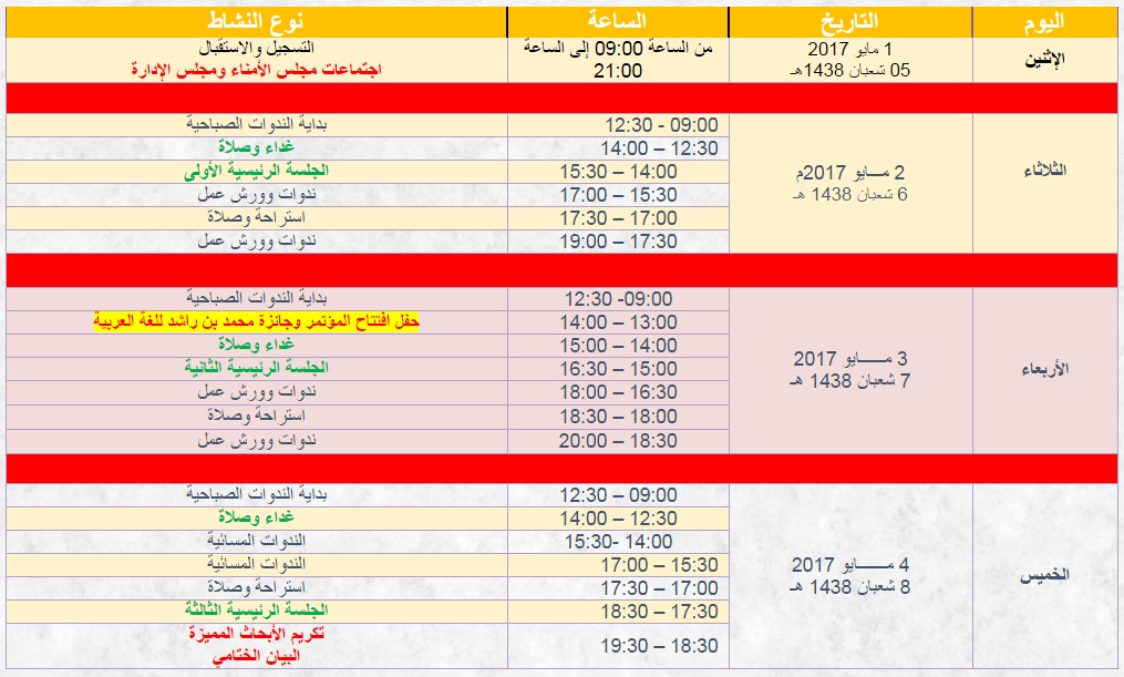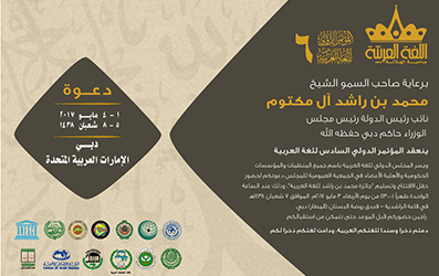 ينعقد المؤتمر الدولي السادس للغة العربية خلال الفترة من 1 حتى 4 مايو 2017 الموافق 5 - 8 شعبان 1438هـ في دبي.