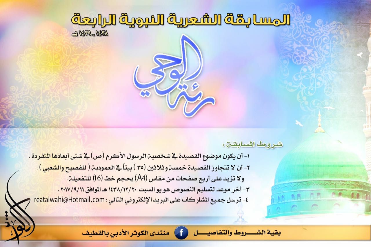 أطلق منتدى الكوثر الأدبي بالقطيف المسابقة الشعرية النبوية "رئة الوحي" بشقيها الفصيح والشعبي في نسختها الرابعة (1438-1439) وحدد المنتدى شروط المسابقة، وهي: