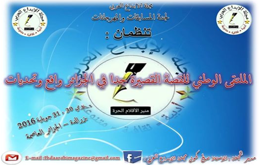 كشف الأستاذ صالح كحول مدير تحرير مجلة الإبداع العربي الإلكترونية عن التحضير لإطلاق الملتقى الوطني الثاني للقصة القصيرة جدًّا بالجزائر والذي يشارك فيه أربعة وأربعون بين قاص وناقد، سيتم نشر تفاصيله قريبًا.