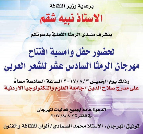 انطلقت في الساعة السادسة من مساء أمس الخميس الموافق 3 أغسطس 2017 فعاليات مهرجان الرمثا للشعر العربي السادس عشر، حيث تقام فعالية حفل الافتتاح في جامعة العلوم والتكنولوجيا، وتشتمل على كلمات وقراءات شعرية.