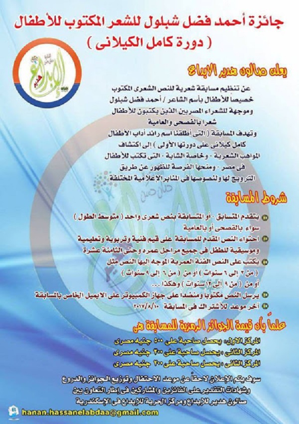 أعلن صالون هدير الإبداع الأدبي بالإسكندرية عن فتح باب التقديم في الدورة الأولى لجائزة "أحمد فضل شبلول" للنصوص الشعرية المكتوبة للأطفال، التى تحمل هذا العام اسم الأديب الراحل "كامل الكيلاني".