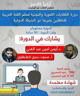 تعلن شركة آرابيا كلاسز عن دورة علمية عبر الشبكة الدولية، وتشتمل هذه الدورة على الكفايات اللغوية والكفايات المهنية التي يحتاجها معلم اللغة العربية للناطقين بغيرها.