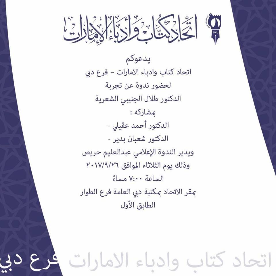 يقيم اتحاد كتاب وأدباء الإمارات أمسية شعرية عن تجربة د. طلال الجنيبي الشعرية،.. وذلك يوم الثلاثاء الموافق ٢٦/٩/٢٠١٧ بمقر الاتحاد بدبي، بصحبة العلمين الجليلين، يشارك في الأمسية: