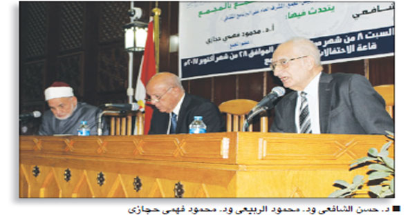 وأضاف د.الشافعي: سعى المجمع إلى كسر العزلة المجمعية، بخطوات عملية مثل إصدار رسالة إخبارية ثقافية غير دورية بعنوان «مجتمعات» تنقل أصداء الحياة المجمعية إلى القراء، وإعداد ثلاثة برامج تدريبية لدعم كفاءة بعض المهنيين ذوى التأثير فى المجتمع، كالمحققين القضائيين، والمذيعين ومُعدى البرامج والمصححين بالصحف اليومية والمجلات الدورية، واستحداث لجان لخدمة المجتمع المصرى والعربى مثل لجنة الشكاوى والإفتاءات اللغوية، ولجنة اللغة العربية فى التعليم، والإعلام، وهما أكثر المجالات تأثيرًا فى حياتنا اللغوية، بالتعاون مع خبراء الإعلام والتربية والتعليم، بجانب مشروعين بالغى الأهمية: القانون المصرى الشامل لحماية اللغة العربية، الذى يجمع ما صدر فى مصر من قرارات وقوانين تتعلق باللغة العربية من 1942 وما أصدره الرئيس عبد الناصر عام 1958، وغيرهما، وانتهاءً بما أصدره البرلمان المصرى 2008، واعتبار توصيات المجمع وقراراته مُلزمة لجميع إدارات الدولة وهيئات المجتمع المدنى متى نُشرت بالجريدة الرسمية، وإصدار المعجم التاريخى للغة العربية، الذى يتتبع تاريخ ظهور الكلمة، عند مولدها على لسان أول عربى نطق بها، ثم تطورها معنًى ومبنًي، على مدار التاريخ إلى الوقت الحاضر.