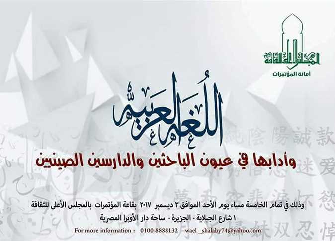 يقيم المجلس الأعلى للثقافة، بأمانة الدكتور حاتم ربيع، ندوة بعنوان «اللغة العربية وآدابها في عيون الباحثين والدارسين الصينيين»، وذلك في الخامسة من مساء يوم الأحد الموافق ٣ ديسمبر الجارى، بقاعة المؤتمرات بالمجلس.