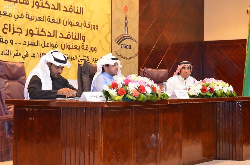 أقام النادي الأدبي الثقافي بمنطقة تبوك مساء أمس ، لقاءً ثقافياً جمع فيه مثقفين ومثقفات من المهتمين بشؤون اللغة العربية وهمومها، تضمن ورقتي عمل بعنوان "اللغة العربية في معيار النقد الحضاري" لناقد الدكتور هاجد الحربي، و"فواعل السرد.. ومقاصد كتابة الذات" للناقد الدكتور جزاع فرحان.