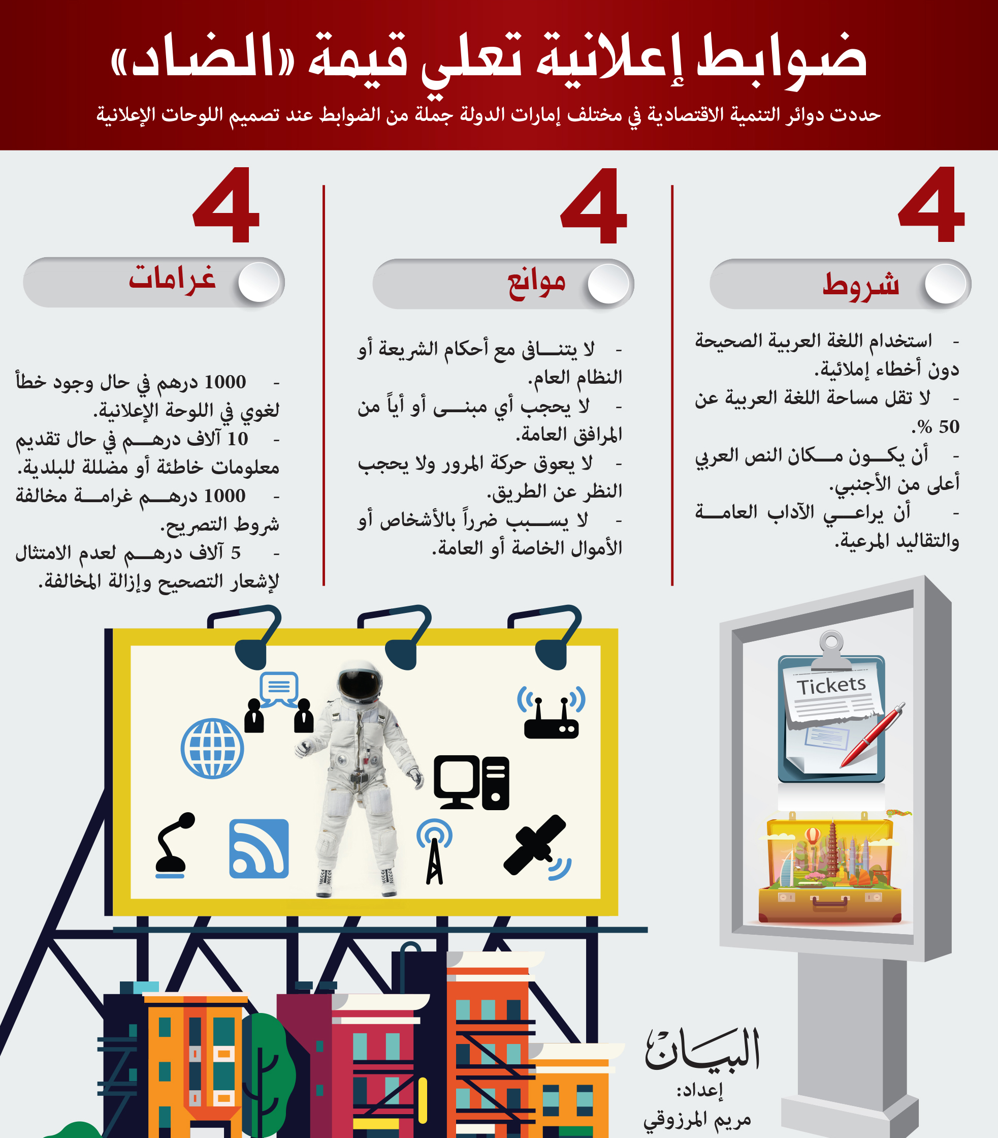 قالت طاهرة أحمد حسين، رئيسة شعبة الخدمات الإعلانية في بلدية دبي، إن البلدية أصدرت في 2013 بالتعاون مع هيئة الطرق والمواصلات في دبي، دليلَ الإعلانات الخارجية الموحّد، الذي يصنف أنواع الإعلانات الخارجية، والمحتوى الإعلاني الذي يركّز في مجمله على اللغة العربية والهوية الوطنية والعنصر الأخلاقي والعنصر الجمالي وعنصري السلامة والوضوح.