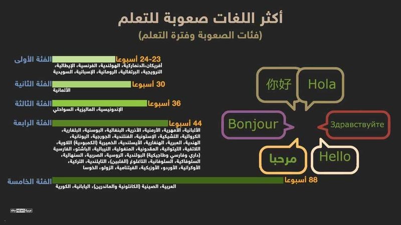 وبحسب دراسات نقلتها "سكاي نيوز عربية"؛ فقد تم تصنيف اللغات العالمية المختلفة بحسب صعوبة تعلمها والفترة الزمنية التي يستغرقها تعلم تلك اللغات.