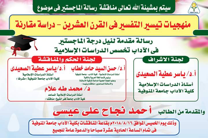 مناقشة ماجستير: "منهجيات تيسير التفسير في القرن العشرين..دراسة مقارنة"