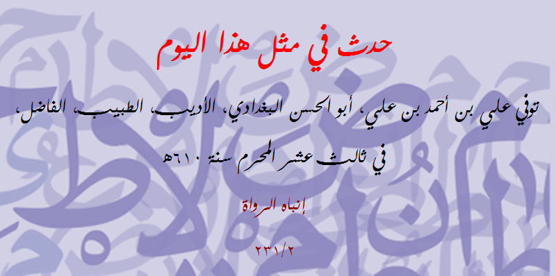 حدث في مثل هذا اليوم (234): توفي أبو الحسن البغدادي الأديب الفاضل الحكيم